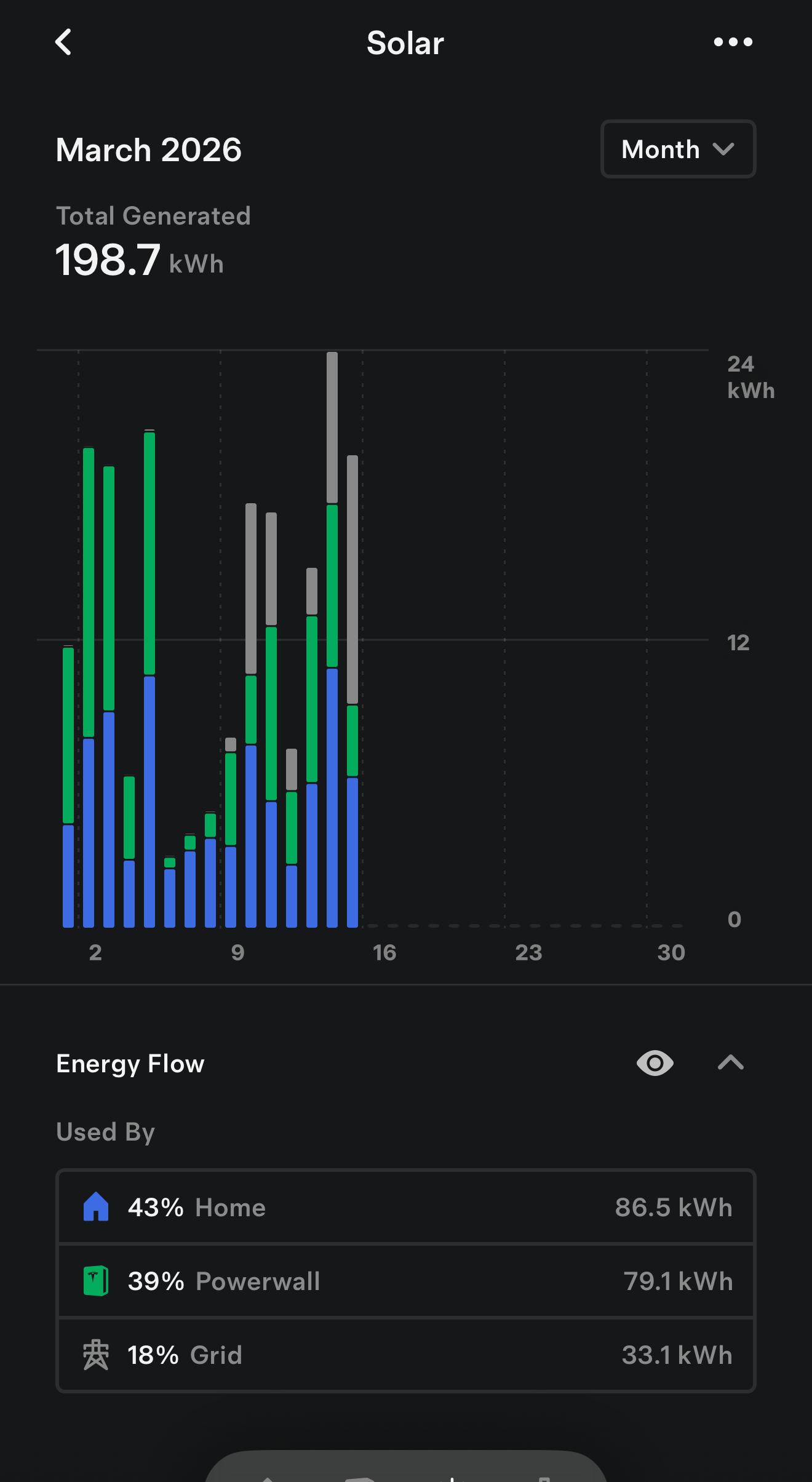 - March 2026 (first 15 days): 198.7 kWh generated